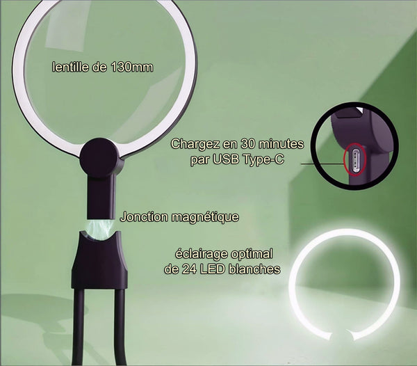 La loupe se recharge en 30 minutes et offre plusieurs heures d'utilisation continue.